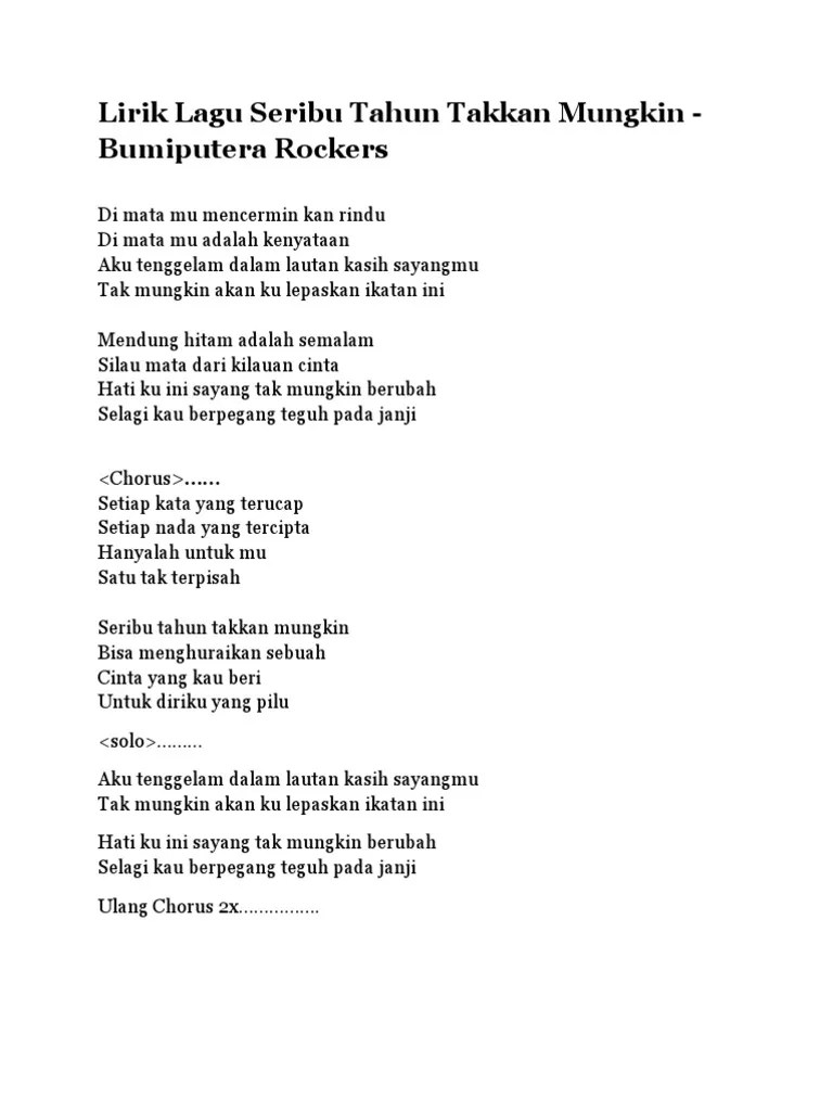 Layanan mobile dari situs entertainment terbesar indonesia, kapanlagi.com. Seribu tahun takkan mungkin / intro am g e e f dm e e am g am g / verse repeat 2x am g e e di matamu mencerminkan rindu am g e e di matamu adalah . Di mata mu mencermin kan rindu. Di mata mu adalah kenyataan. Pada kesempatan kali ini kami hadirkan lirik lagu seribu tahun takkan mungkin yang merupakan salah satu karya bumiputra rockers.